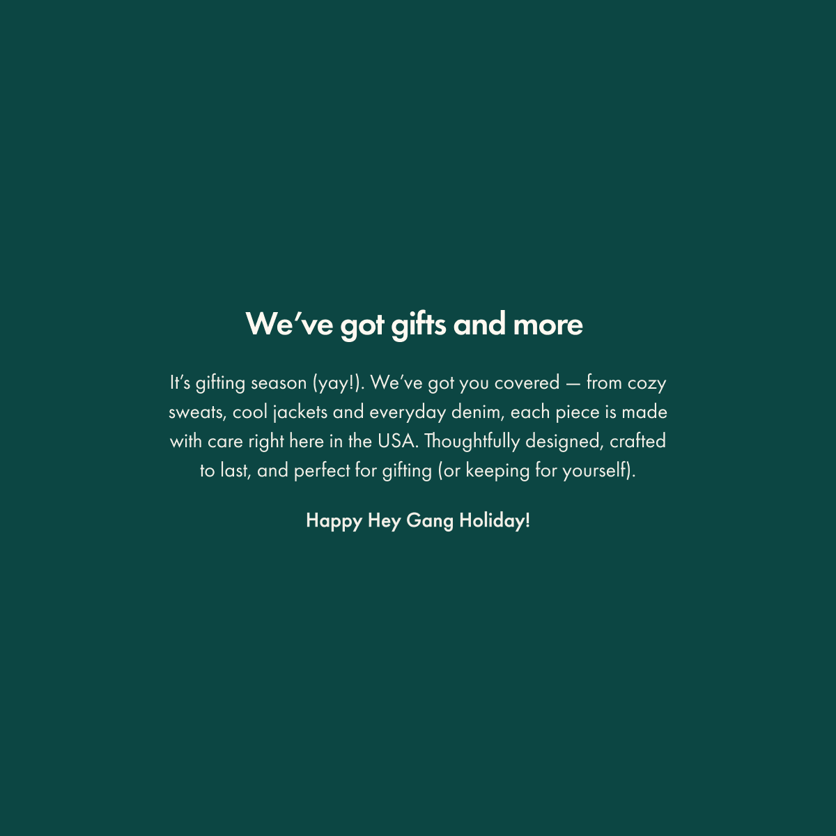 It's gifting season (yay!). We've got you covered - from cozy sweats, cool jackets and everyday denim, each piece is made with care right here in the USA. Thoughtfully designed, crafted to last, and perfect for gifting (or keeping for yourself).